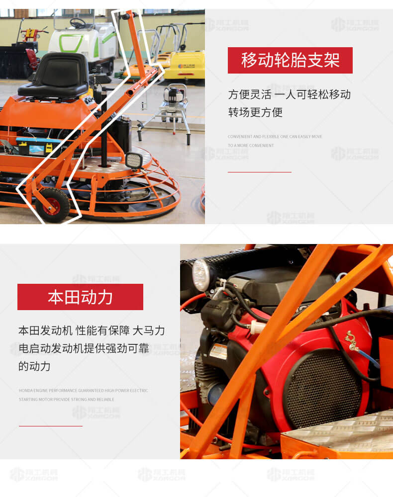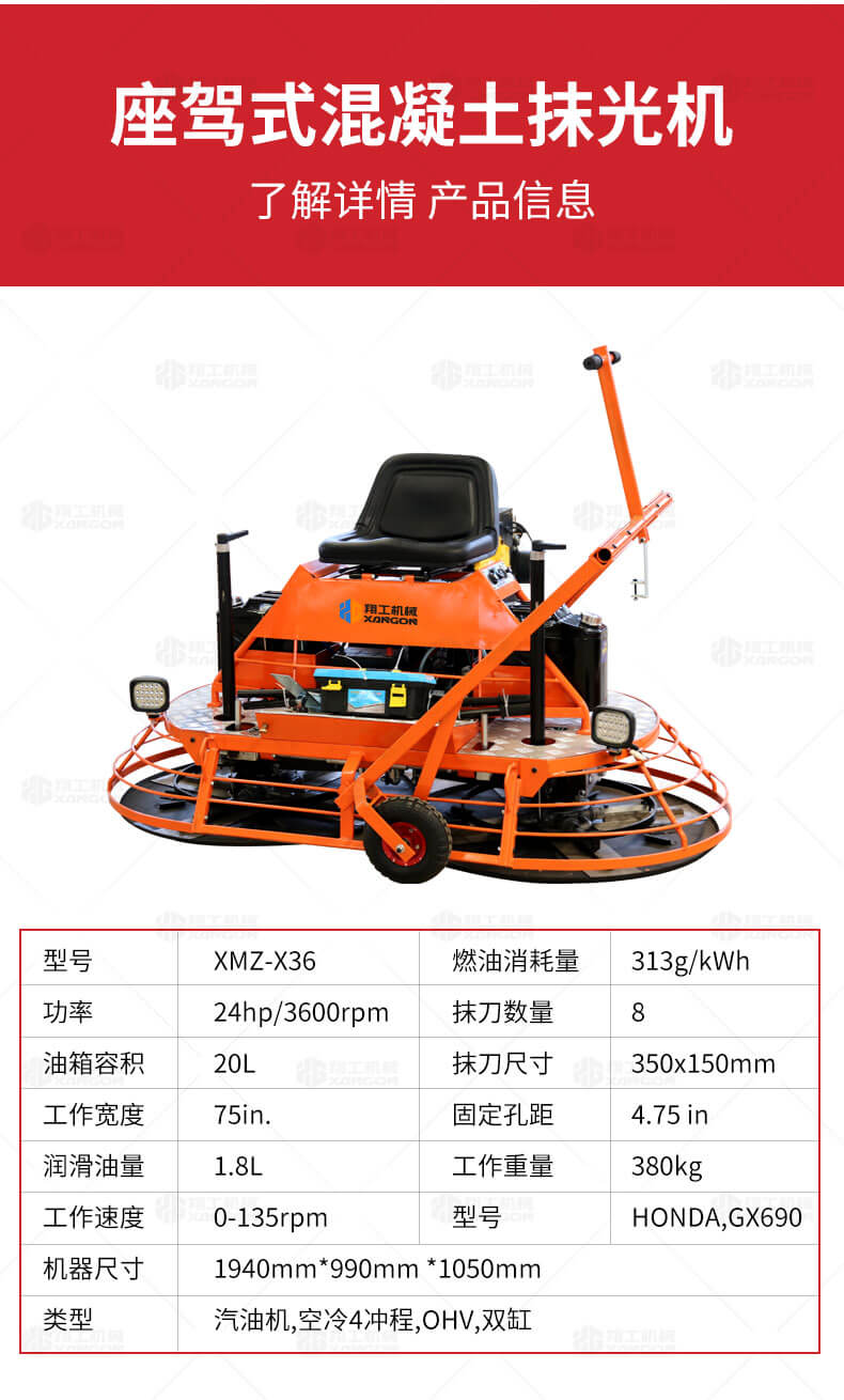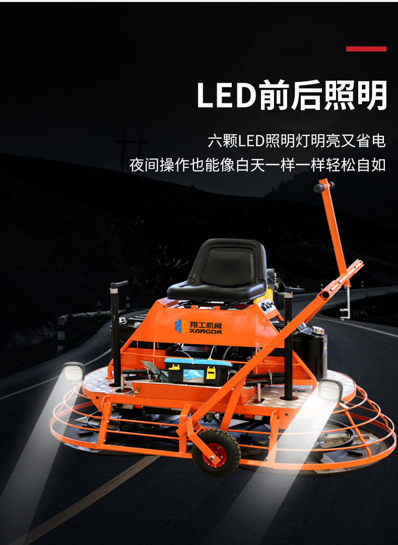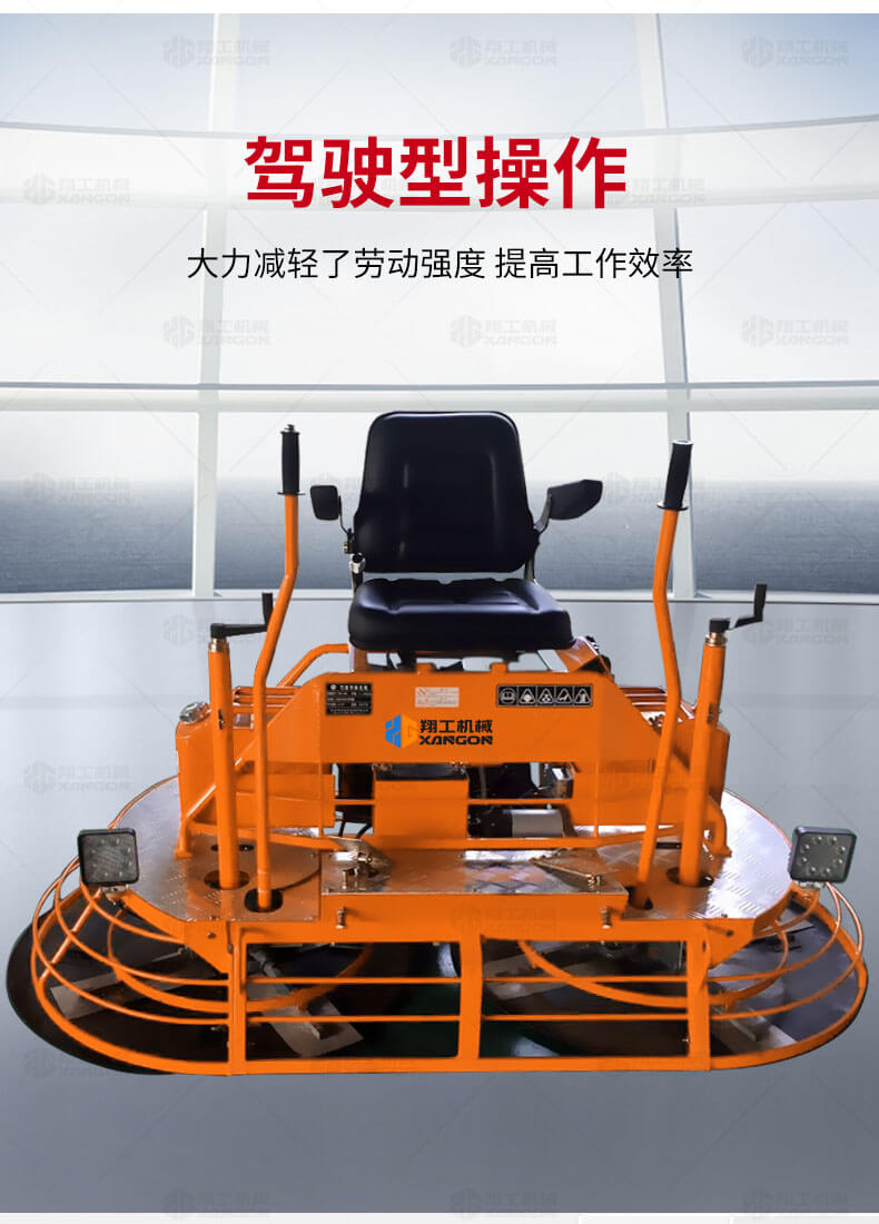 座駕式混凝土抹光機(jī)用于混凝土地面的提漿、壓實(shí)、抹平、抹光,相對于手扶式抹光機(jī),效率高。