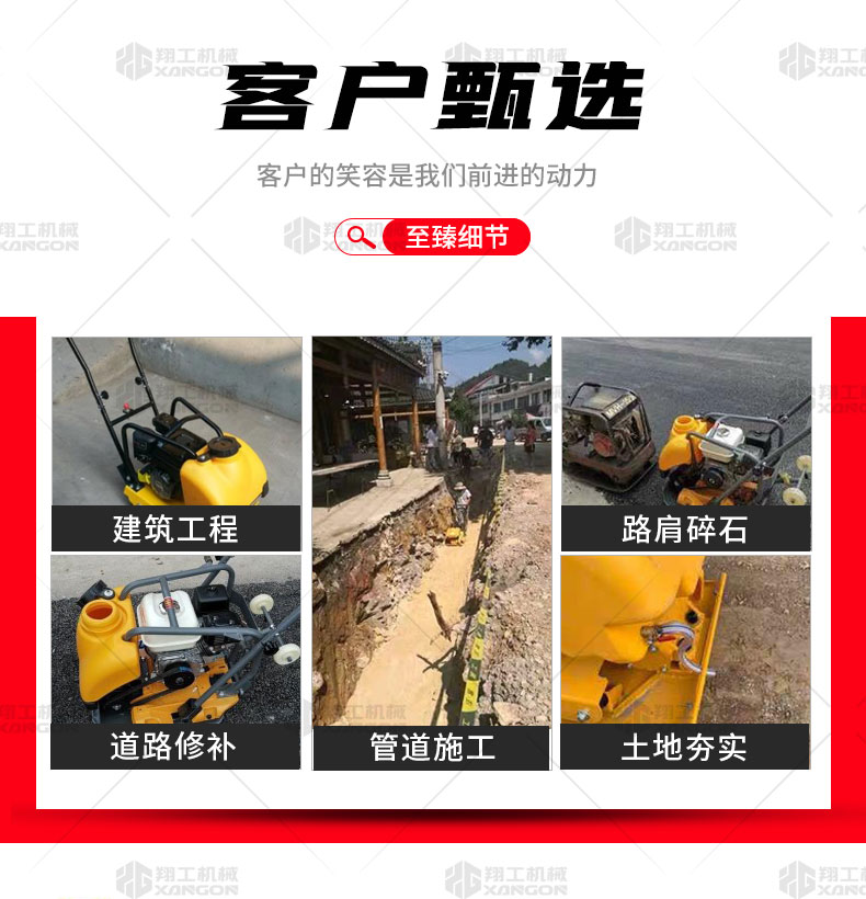 單向平板夯XPB-20適用于路基邊緣、橋涵、管道、溝槽底部等狹長地帶的壓實。 HONDA動力,性能優(yōu)越,啟動容易 采用單獨懸掛式強力減震機構(gòu),減少對發(fā)動機的沖擊,提高操作人員的舒服感;