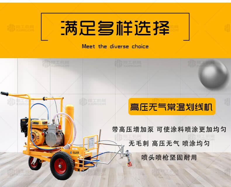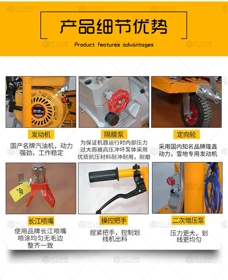 高壓無氣常溫劃線機(jī)利用汽油機(jī)驅(qū)動單注塞泵,使涂料在機(jī)內(nèi)形成高壓進(jìn)行噴涂,索劃線厚薄均勻邊角齊,噴槍架導(dǎo)向桿升降設(shè)計(jì),調(diào)節(jié)噴涂寬度更為準(zhǔn)確方便。該機(jī)器是常溫標(biāo)線施工的專用設(shè)備,主要用于公路、停車場、機(jī)場、加油站、公司廠區(qū)等涂畫直線、虛線、曲線、斑馬線、文字、箭頭、圖形、標(biāo)志等。