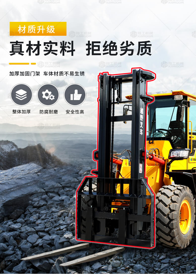 越野叉車可以在坡地和不平地面上進(jìn)行貨物裝、卸、堆垛及搬運(yùn)作業(yè),具有良好的機(jī)動(dòng)性、越野性可靠性。其功能多樣,可搭配側(cè)移器、調(diào)距叉、旋轉(zhuǎn)器、軟包夾、推出器、側(cè)翻叉、側(cè)翻斗、起重臂等工具完成不同的工作。