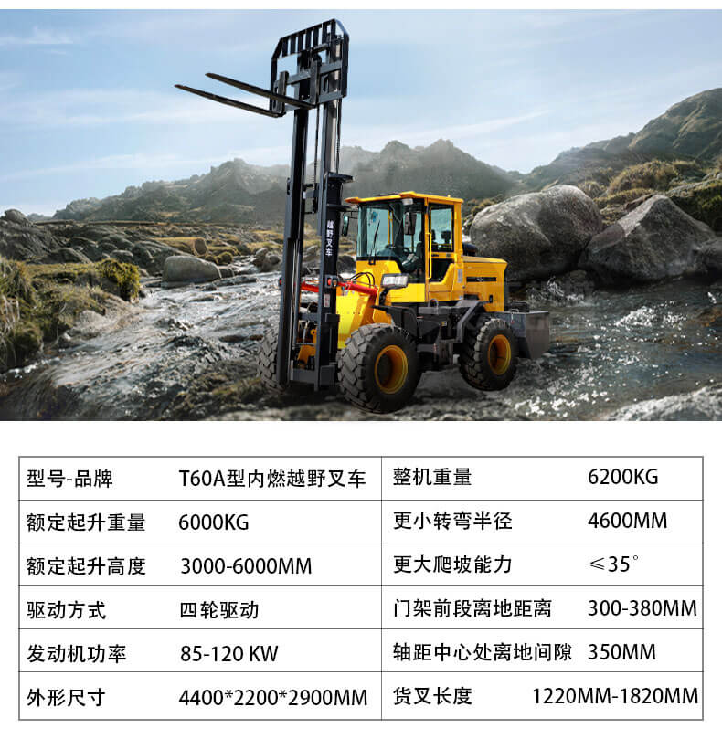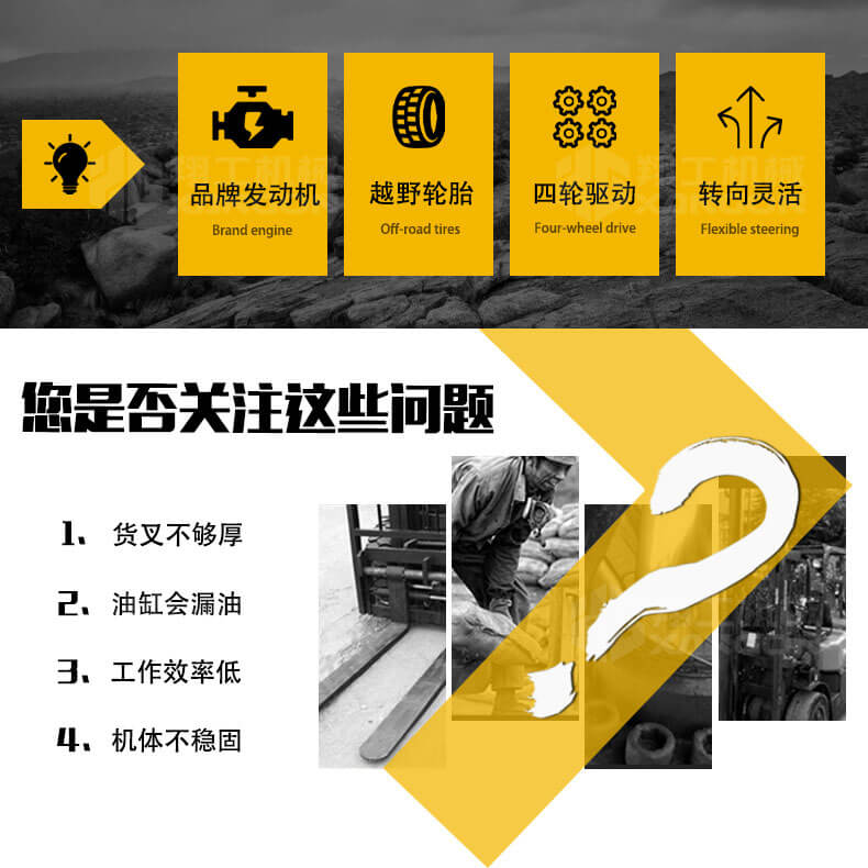 5.越野叉車發(fā)動機功率大,采用全輪驅動和越野輪胎。