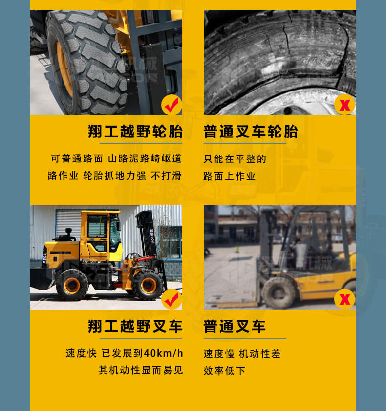 3.普通叉車只能在平整的路面上作業(yè),而越野叉車既可以在普通路面上作業(yè),還可以在山路泥路崎嶇道路作業(yè),輪胎抓地力強,不打滑。