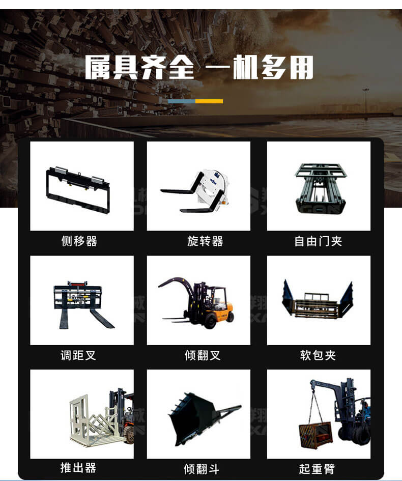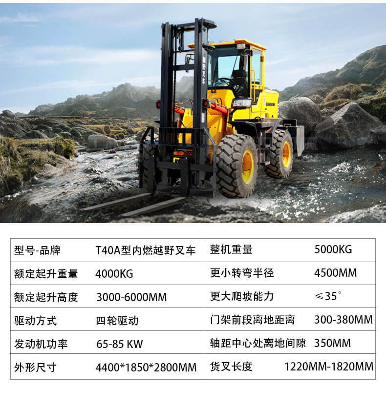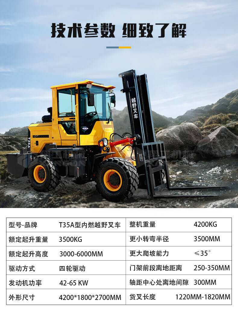 T35A型內燃越野叉車可以在坡地和不平地面上進行貨物裝、卸、堆垛及搬運作業(yè),具有良好的機動性、越野性可靠性。其功能多樣,可搭配側移器、調距叉、旋轉器、軟包夾、推出器、側翻叉、側翻斗、起重臂等工具完成不同的工作。