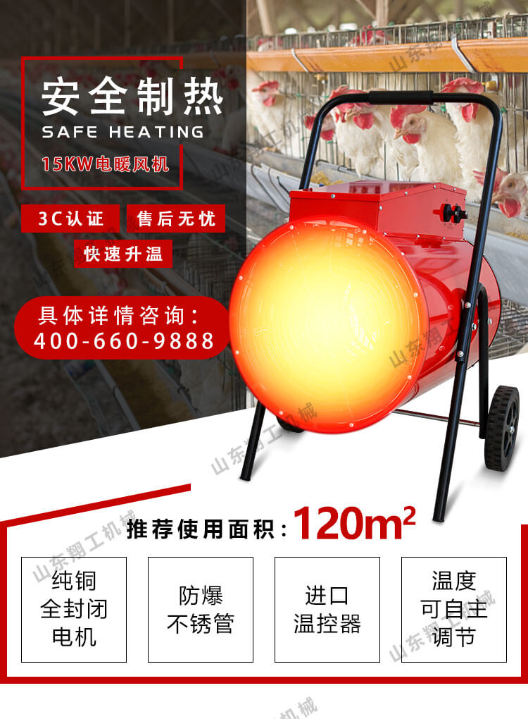 15KW電暖風(fēng)機(jī)優(yōu)點(diǎn): 1、純銅全封閉電機(jī) 2、防爆不銹管(不銹管發(fā)熱元件作熱源保證產(chǎn)品的可靠) 3、取暖溫度可自動調(diào)節(jié)(調(diào)節(jié)功率) 4、進(jìn)口溫控器 5、外殼絕緣,防水