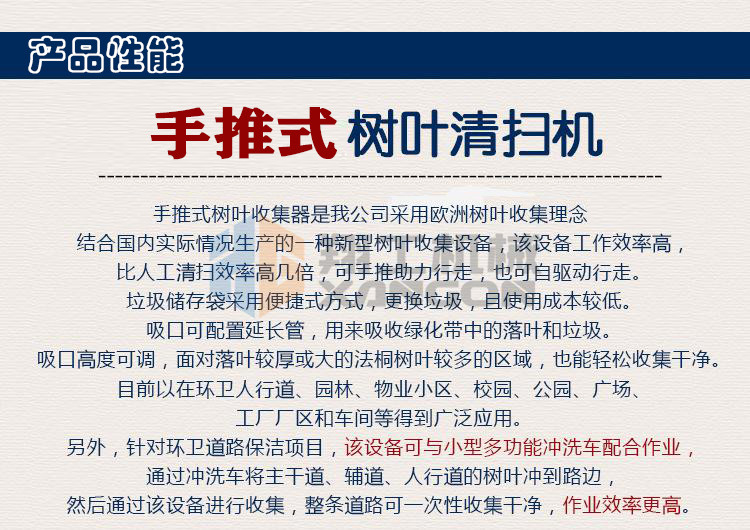 該設(shè)備工作效率高,比人工清掃效率高幾倍,可手推助力行走。垃圾儲存袋采用便捷式方式,便于更換垃圾,且使用成本較低。吸口可配置延長管,用來吸收綠化帶中的落葉和垃圾。吸口高度可調(diào),面對落葉較厚或大的法桐樹葉較多的區(qū)域,也能輕松收集干凈。目前以用在環(huán)衛(wèi)人行道、園林、物業(yè)小區(qū)、校園、公園、廣場、工廠廠區(qū)和車間等得到廣泛應(yīng)用。