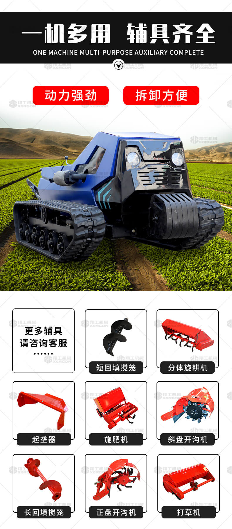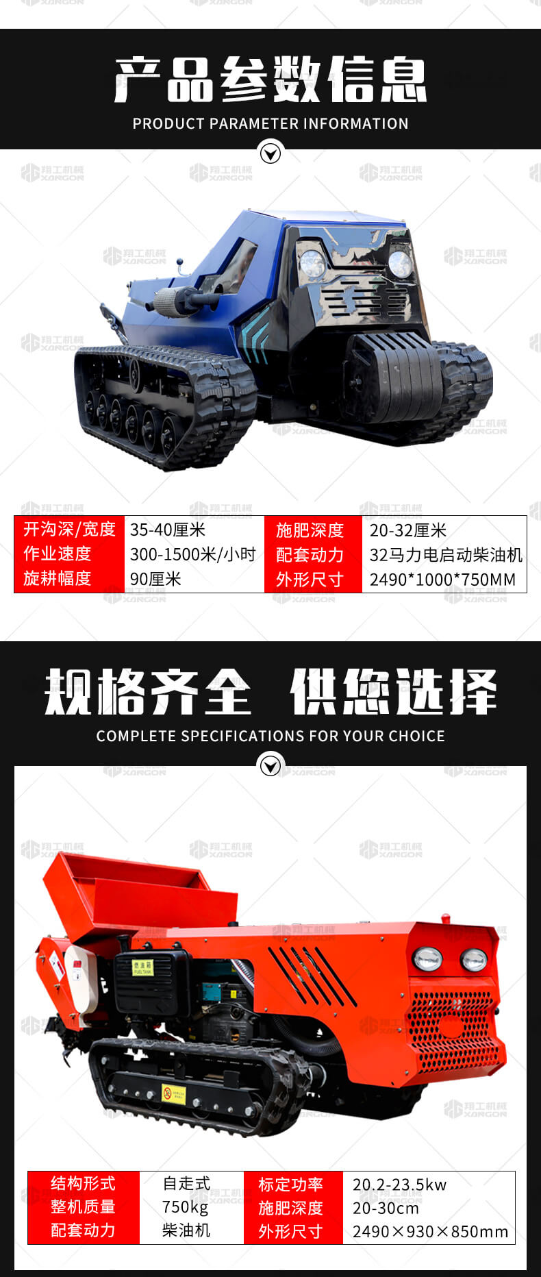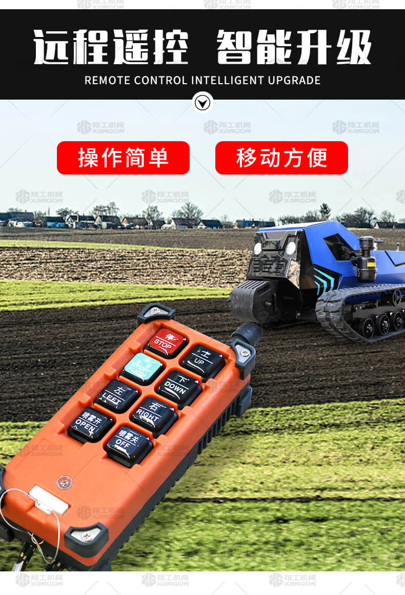 本產(chǎn)品采用履帶式驅(qū)動設(shè)計,穩(wěn)定性和爬坡能力較強,適應(yīng)丘陵山地平原各種地形,機型小功率大,適應(yīng)各種行距的果樹,大棚,園林。產(chǎn)品動力強勁,結(jié)實耐用,性能優(yōu)越,安全放心,遠(yuǎn)程操控,省心省力。