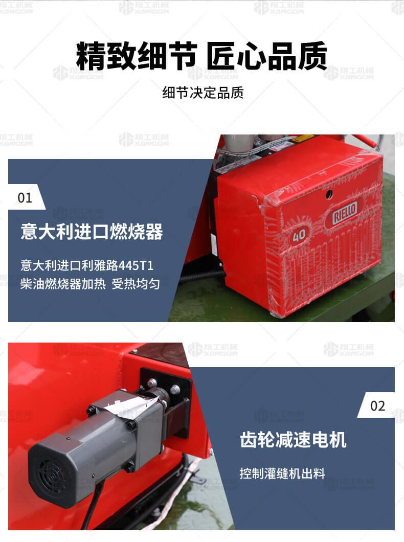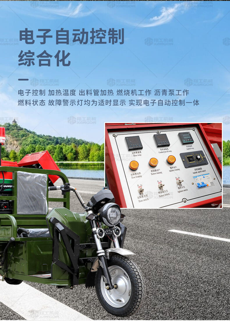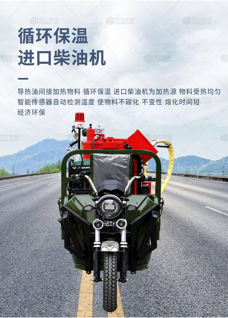 主要用于瀝青或水泥路面裂縫瀝青灌縫。汽油灌縫機主要有手推式和自行式手持灌縫管操作,采用進口柴油燃燒器加熱。在工作時首先在料箱內(nèi)加入瀝青或灌縫膠,啟動發(fā)電機供電,依次間斷打開導(dǎo)熱油泵開關(guān),燃燒器開關(guān),出料管加熱開關(guān);調(diào)整自動溫控系統(tǒng)與材料的溫度相同,通過柴油燃燒器自動加熱熔料箱內(nèi)導(dǎo)熱油開始升溫(拖式為強制循環(huán))使材料融化,溫度是通過自控系統(tǒng)來控制。溶料時間大約30-40分鐘左右。在材料融化、出料管溫度達到后可以進行工作。手持灌縫管對正裂縫灌縫處理。瀝青泵的出料流量可調(diào)。在工作過程中隨時添加材料保證工作的連續(xù)性。