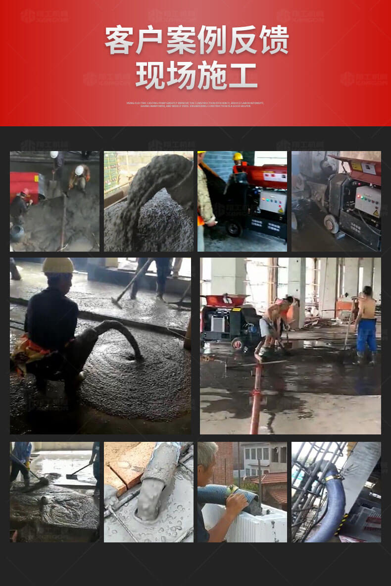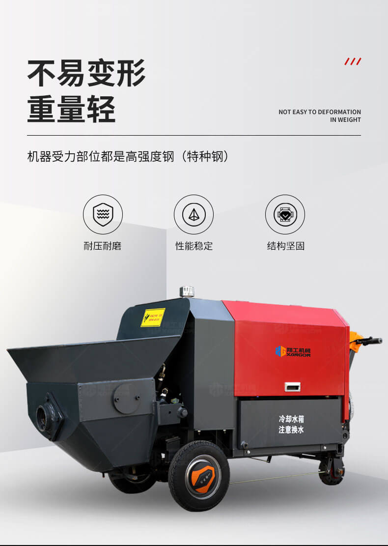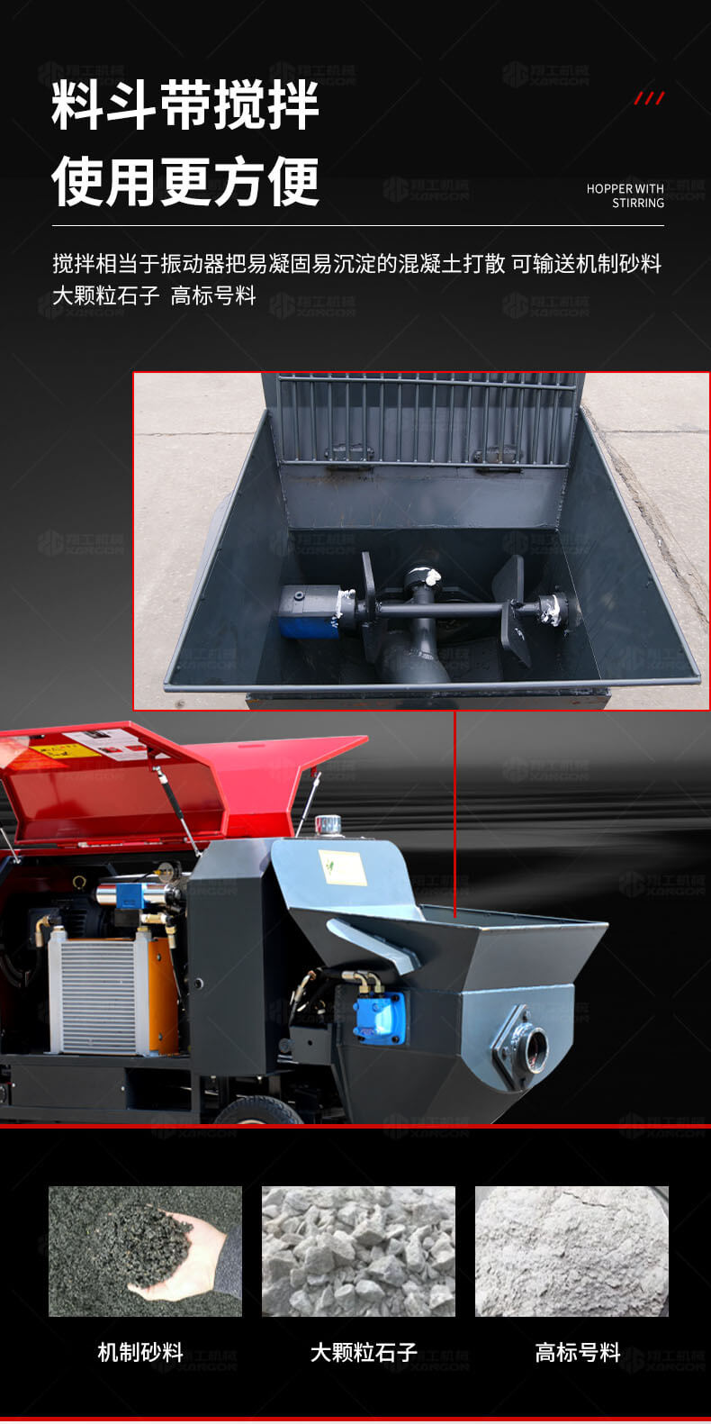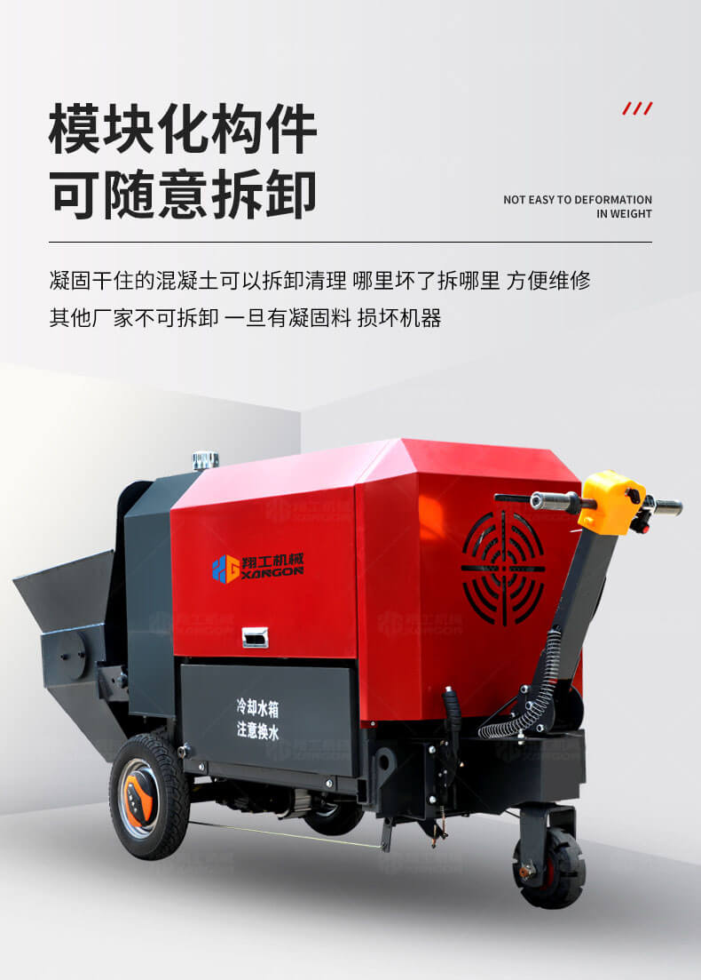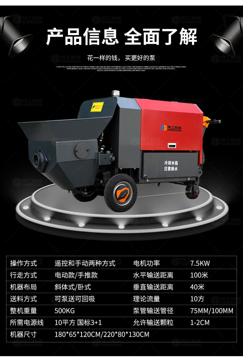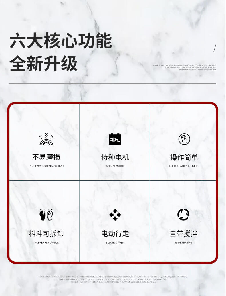 這款7.5KW型澆筑泵帶有自動攪拌功能,性能可靠,設備各個結(jié)構(gòu)制造科學,電機功率大、性能穩(wěn)定、施工效率高等優(yōu)勢,使用電動澆筑泵大大提高了施工效率,降低勞動強度,節(jié)約人工,被廣泛應用。是工程施工的好幫手。