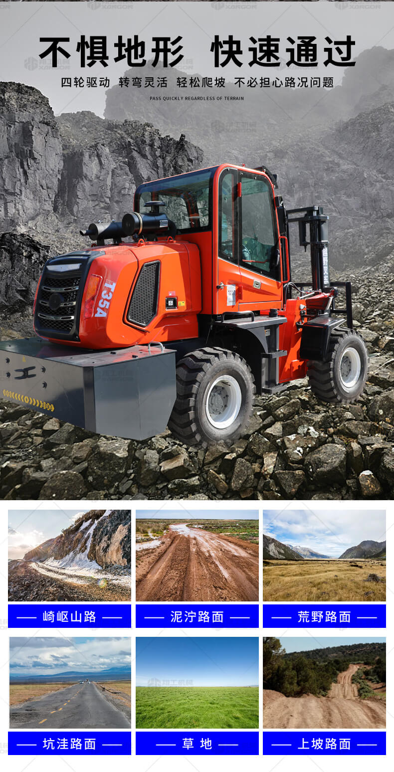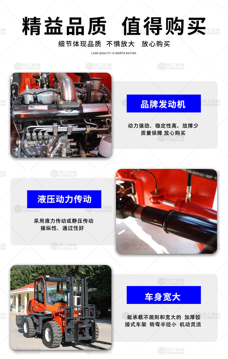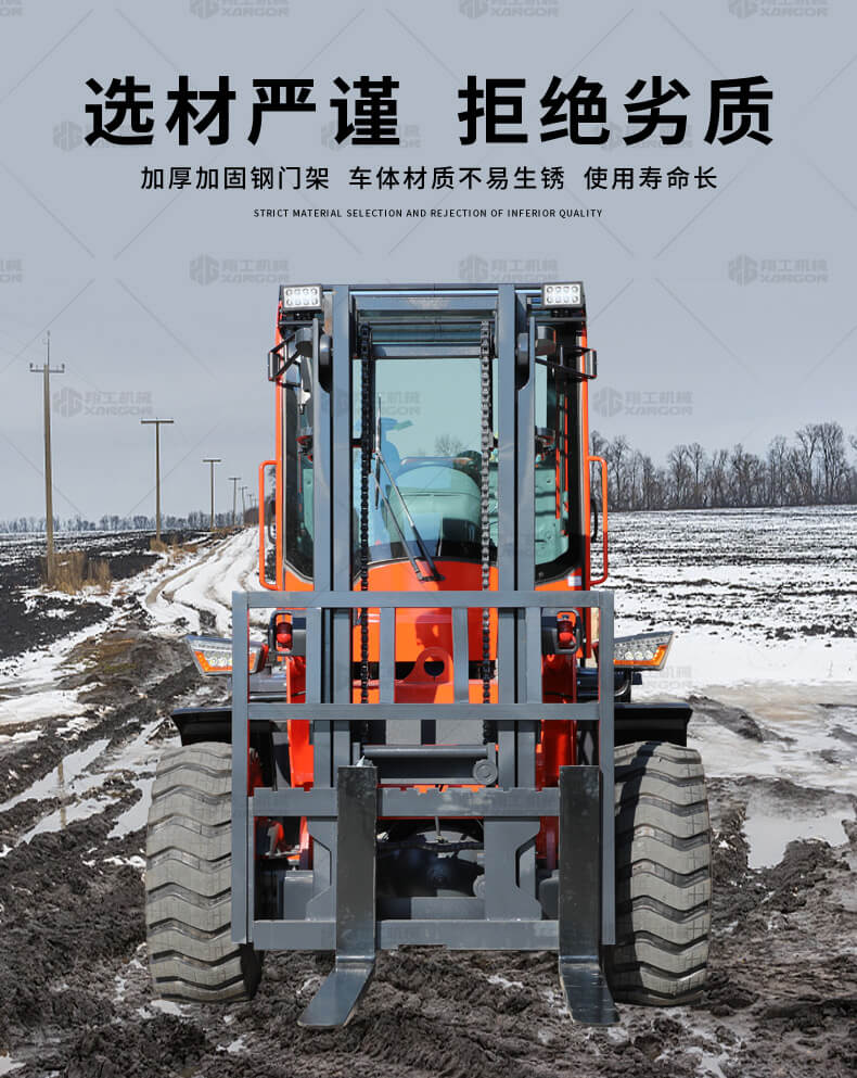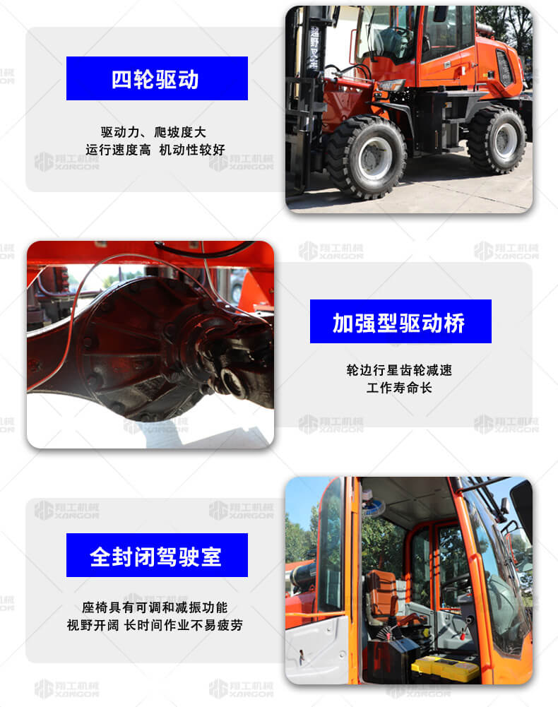 越野叉車可以在坡地和不平地面上進(jìn)行貨物裝、卸、堆垛及搬運(yùn)作業(yè),具有良好的機(jī)動(dòng)性、越野性可靠性。其功能多樣,可搭配側(cè)移器、調(diào)距叉、旋轉(zhuǎn)器、軟包夾、推出器、側(cè)翻叉、側(cè)翻斗、起重臂等工具完成不同的工作。