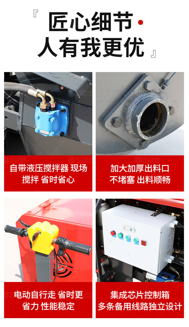 本產(chǎn)品為電動行走臥式造型混凝土輸送泵,料斗帶攪拌功能,可泵送機(jī)制砂;風(fēng)冷散熱,散熱效果好;集成芯片控制箱,多條備用線路獨(dú)立設(shè)計(jì),不用擔(dān)心控制系統(tǒng)問題;操作部件采用24v 安全感應(yīng)電壓,安全可靠;S 彎采用兩個單向油缸,速度均勻。