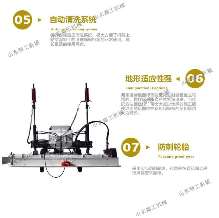翔工機(jī)械精心研制開發(fā)的激光混凝土整平機(jī)利用先進(jìn)的激光發(fā)射接收系統(tǒng)形成的閉環(huán)回路控制整平板尺的工作,精度高,廣泛用于現(xiàn)代工業(yè)廠房、大型購物場所、貨倉及其它大面積混凝土地面施工。