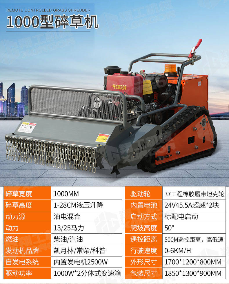XG-1000遙控碎草機,是一款革新園林養(yǎng)護的智能裝備。它融合遠程遙控與自主碎草功能,操作便捷省力。設備動力強勁,碎草細膩,能直接將雜草轉化為有機綠肥,促進草坪健康生長。適用于大型草坪、莊園及專業(yè)綠地,作業(yè)高效,是提升養(yǎng)護品質、實現(xiàn)綠色循環(huán)的理想選擇。